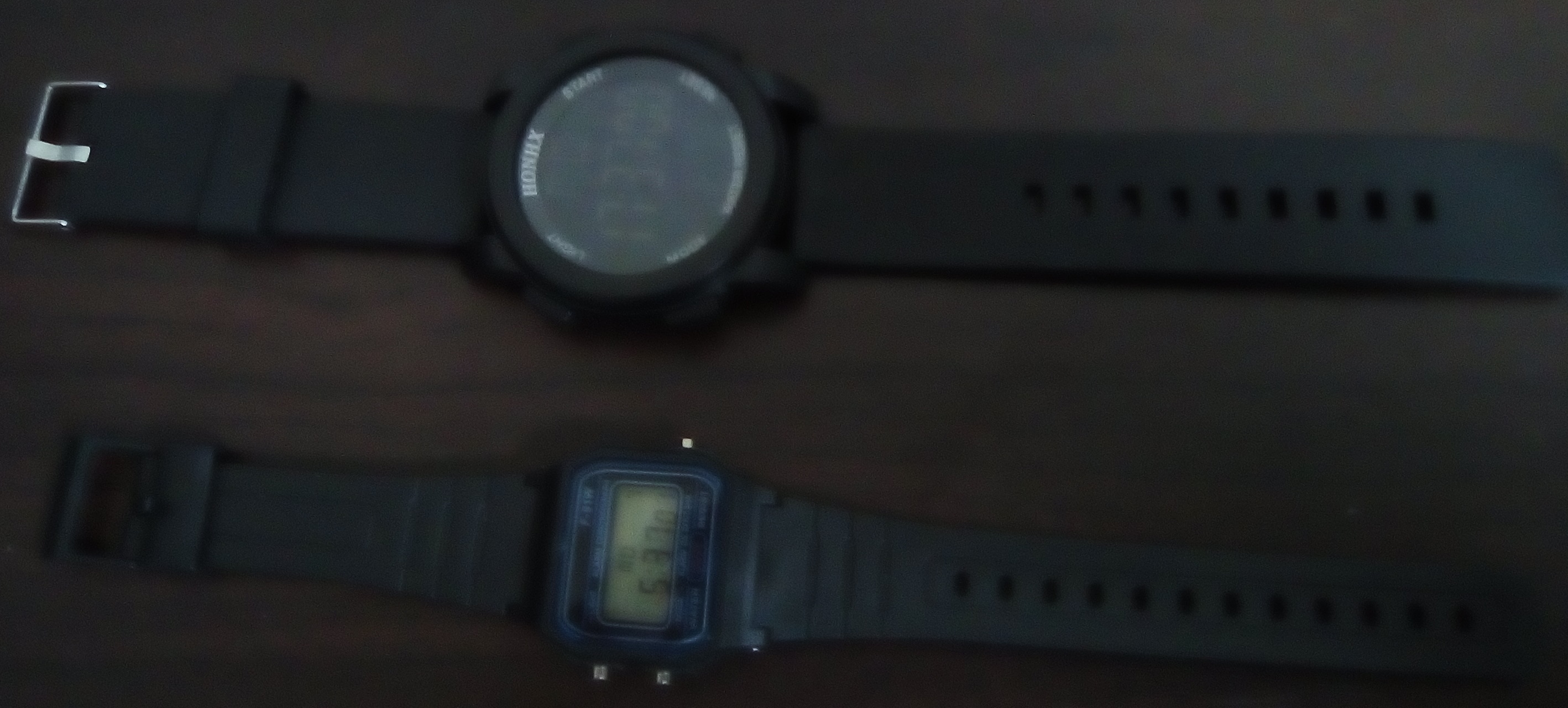 F-91Wの方はバックライトが暗すぎて時刻が全く見えません。※ピンボケだから見えないのではなく、肉眼でも暗すぎて見えません。